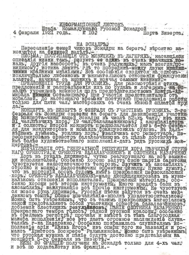 Un concert sera organisé le 5 février au Cercle des officiers de Bizerte. Se produiront, le capitaine de frégate Guildebrandt au piano, le marin Nazarenko qui chantera, l’orchestre de balalaïkas, un chœur de 30 personnes, la dimension de la salle ne permettant pas au chœur entier de se produire.