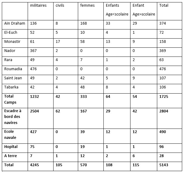 Au 23 avril 1921, la répartition dans les camps, l’escadre, l’école navale, l’hôpital et ceux vivant à terre et assurant eux-mêmes leur subsistance était la suivante[1] :