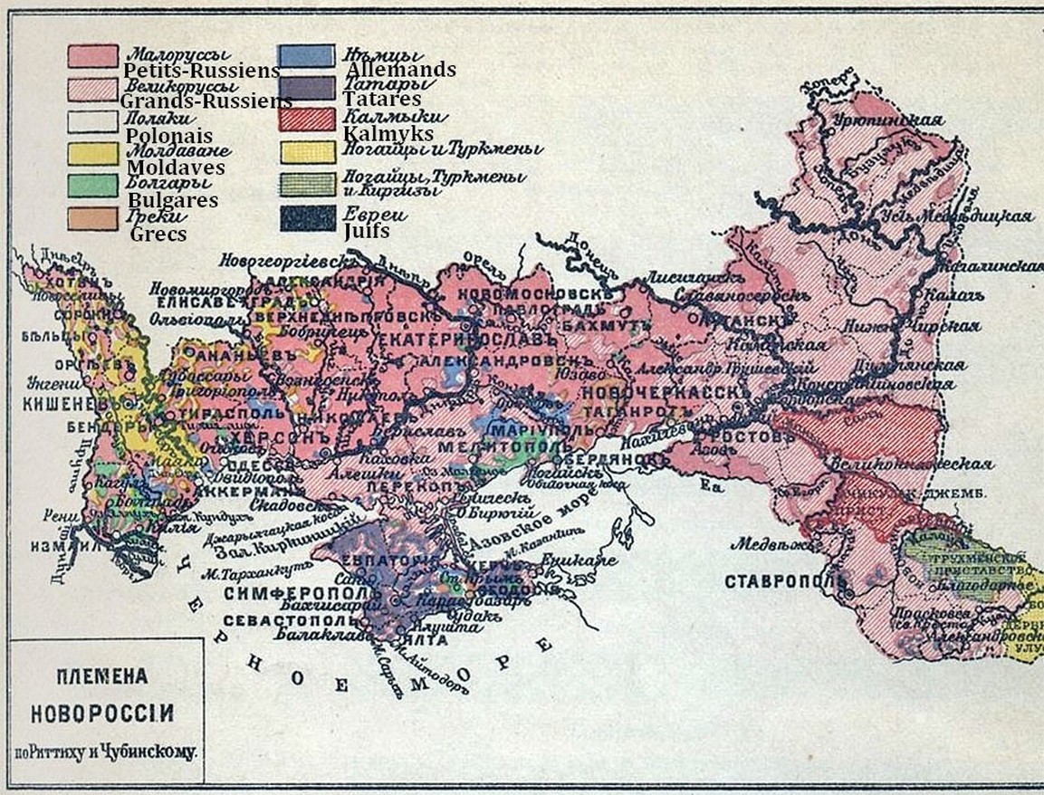 Une autre carte des peuples de Nouvelle Russie avait été rééditée en 1910 pour les territoires du gouvernement de Nouvelle Russie par A. F. Rittikh et Tchoubinski. Сette carte ne diffère pas de la première.