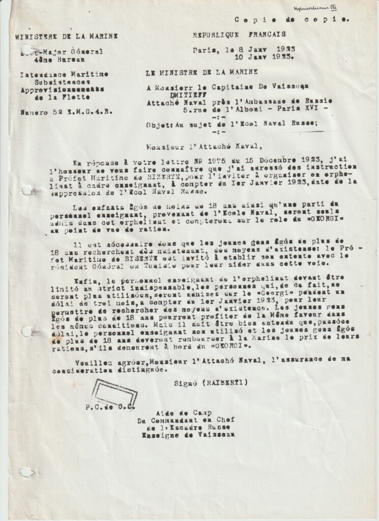 L’inspecteur, le capitaine de vaisseau Kolner remplaçant le capitaine de vaisseau Alexandroff depuis 1922, quitta Bizerte pour Paris. Il fut remplacé par l’enseignant I. V. Dembovski. Le capitaine de vaisseau Kititsyne responsable des exercices en rang, quitta Bizerte pour les USA le 18 août comme son aide de camp, le lieutenant de vaisseau N. N. Solovioff qui avait déjà quitté Bizerte bien avant. Le général-major Zavalichine remplaça le capitaine de vaisseau Kititsyne et le lieutenant Lemlein, l’aide de camp.