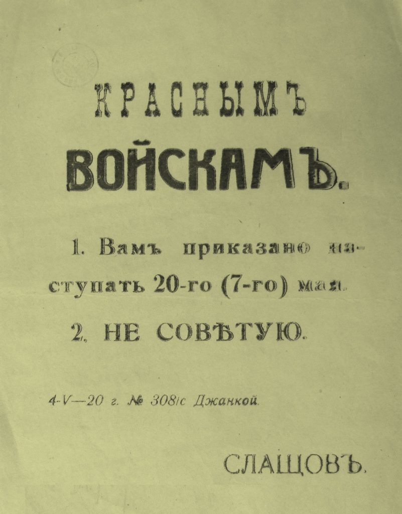 Le général-lieutenant Jacob Alexandrovitch Slachtchoff était un commandant d’un courage frisant l’inconscience, brillant tacticien, il sera appelé Slachtchoff-Krymskyi[3] en raison de ses exploits. L’absence de contrôle, l’impunité, les excès en tout genre, la drogue qu’il prenait suite à ses multiples blessures, l’alcool, lui font perdre le sens des réalités et des limites de ses compétences. Après l’évacuation de Crimée, il retournera en Russie soviétique en 1921, prêchera le retour et arrivera à convaincre hommes du rang et officiers. Il enseignera la tactique aux officiers supérieurs de l’Armée rouge. Il sera assassiné en 1929 par Lazare Kolenberg qui avait un mobile[4] mais sera jugé irresponsable. Il faut préciser que les répressions Staliniennes prennent de la vitesse dès 1927 et que les « rapatriés » Blancs sont une des cibles. Condamné à mort par les Blancs pour son retour et sa trahison, il sera exécuté par les Rouges.