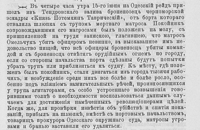 « Le cuirassé Kniaz Potemkine est arrivé hier soir avec deux torpilleurs, et bientôt la nouvelle s’est répandue en ville, que l’équipage avait massacré ses officiers pour venger le matelot Omeltchouk tué par un officier »