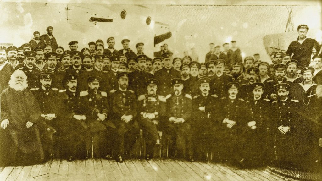 Parmi les officiers, six sont expérimentés, bien peu pour un navire aussi important, le commandant, le capitaine de vaisseau E. N. Golikoff, son second, le capitaine de frégate I. I. Guiliarovski qui vient tout juste d’être affecté au navire, l’officier en chef des mines et torpilles, le lieutenant V. K. Tonne, l’officier en chef d’artillerie L. K. Néoupokoeff, l’officier en chef de navigation, le capitaine G. K. Gourine, l’ingénieur mécanicien en chef N. Y. Tsvetkoff. Tous ont de dix à vingt ans de service et le commandant en a trente.