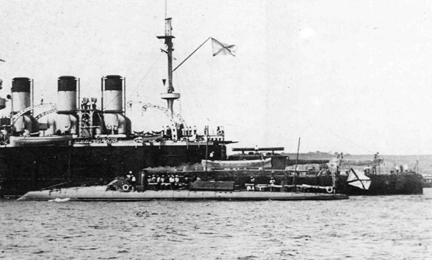 Le cuirassé est accompagné par le torpilleur N° 267, un petit navire vétuste qui sert de navire de service et qui compte un seul officier, le baron P. M. Klodt Von Yourguensbourg[1], un officier d’artillerie.