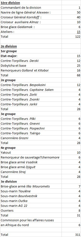 Au 1er avril 66 personnes supplémentaires furent toutefois conservées dans l’escadre sur initiative russe. Les rations n’étaient pas prévues pour ces dernières et on les nourrissait en prélevant sur les rations des autres.
