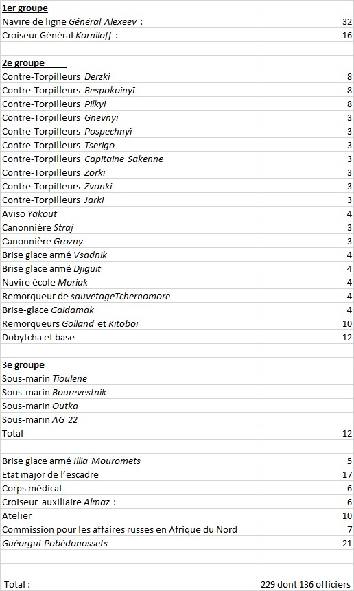 L’amiral Berens reçut Monsieur Zankevitch et lui demanda s’il avait un mandat du général Wrangel, Zankevitch répondit qu’il n’en avait pas besoin et qu’il avait affaire aux autorités françaises et effectivement, les autorités françaises locales le soutenaient, mais mollement,11D’aprés le CR de l’escadre sans grand enthousiasme.