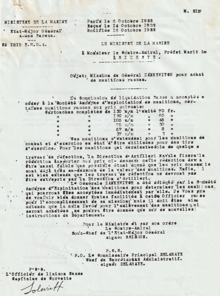 Monsieur Zankevitch informa l’état-major qu’il était venu à Bizerte pour examiner les munitions de l’escadre entreposées dans l’arsenal de Sidi Abdallah et qu’il se proposait de les vendre à l’Estonie. Il faut préciser que L’Estonie, pays indépendant à cette date, possédait deux contre-torpilleurs, le Spartak et l’Avtroil, pris aux Soviétique par les Anglais suite à l’opération navale calamiteuse du membre du Soviet Raskolnikoff et donnés à l’Estonie par les Anglais. L’Estonie disposait également de pièces d’artillerie russes récupérées lors de la défaite de l’Armée blanche du nord-est du général Youdenitch ainsi que de batteries côtières de l’ex-Empire russe situées sur le territoire estonien.