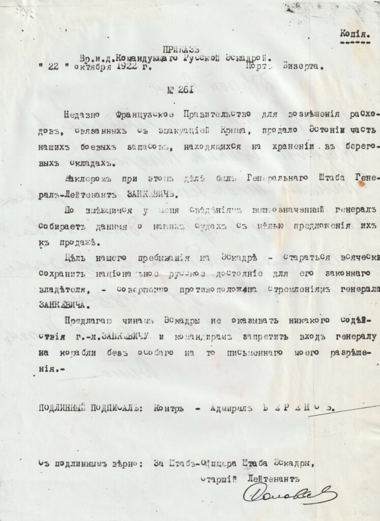 Le 22 octobre 1922 le commandant par intérim émit un ordre12N° 261dans lequel il informa le personnel de l’escadre que Monsieur Zankevitch collectait des informations concernant les navires afin de les proposer à la vente et qu’il proposait de ne pas donner accès aux navires ni de coopérer. Suite à cet ordre, le personnel travaillant pour Monsieur Zankevitch arrêta le travail.