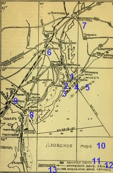 En somme, la 13ᵉ armée soviétique, qui tenait les positions de Perekop, fut complètement écrasée grâce à notre manœuvre de débarquement réussie. Environ 10 000 soldats rouges furent faits prisonniers, plusieurs dizaines de pièces d’artillerie, deux trains blindés, des centaines de mitrailleuses et tout le ravitaillement de l’armée concentré à Melitopol furent capturés. Notre armée subit des pertes relativement faibles et sortit du cul de sac que constituait la Crimée vers les vastes plaines de Tauride. »