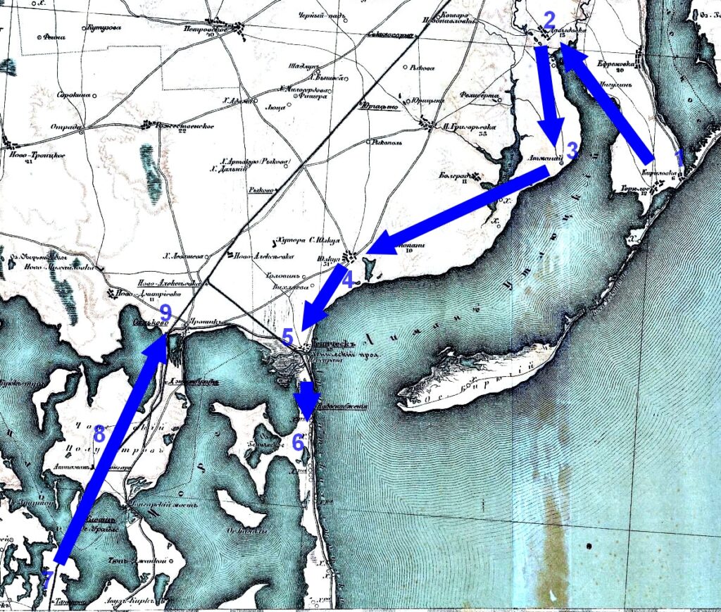 Débarquement : 1 : Kirilovka, 2 : Davidovka, 3 : Atmanaï, 4 : Youzkoul, 5 : Guénitchesk, 6 : Flèche d’Arabatsk.