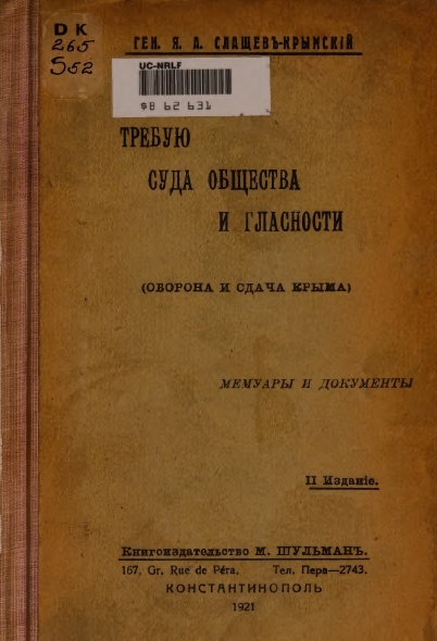Après l’évacuation, à Constantinople, le général Slachtcheff, fut l’initiateur du scandaleux « pamphlet de Constantinople », «J’exige un jugement par la société et la transparence», créé, selon les dires de Slachtcheff lui-même, par le général Kilénine, qui aurait renoncé en être l’auteur sous pression, et achevé par Slachtcheff en personne. Le livre a été rédigé à chaud durant l’hiver 1920-1921, après l’évacuation de la Crimée, en réaction à l’« arbitraire » de Wrangel à l’égard de l’auteur. Il révèle, selon ce dernier, la véritable cause et les véritables responsables de la capitulation de la Crimée.