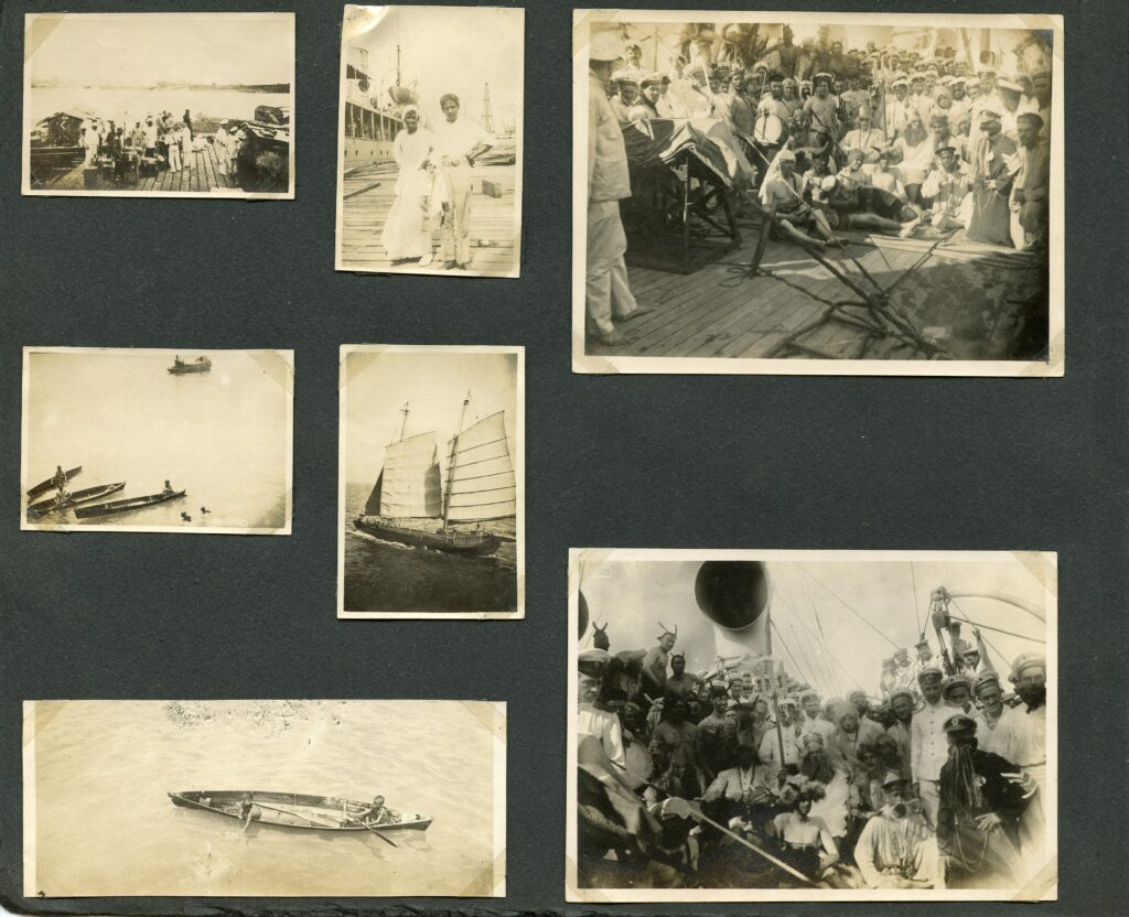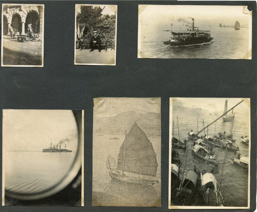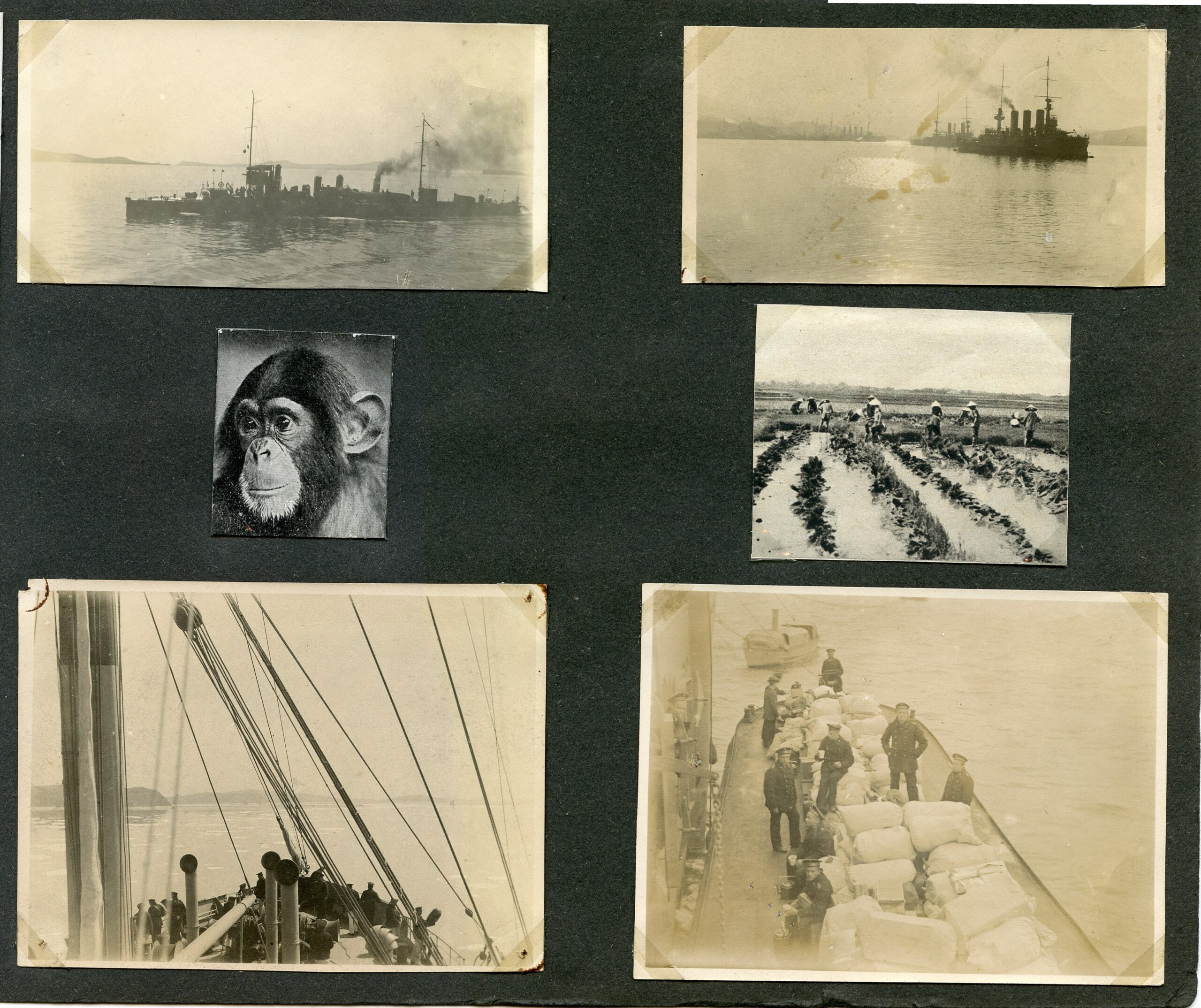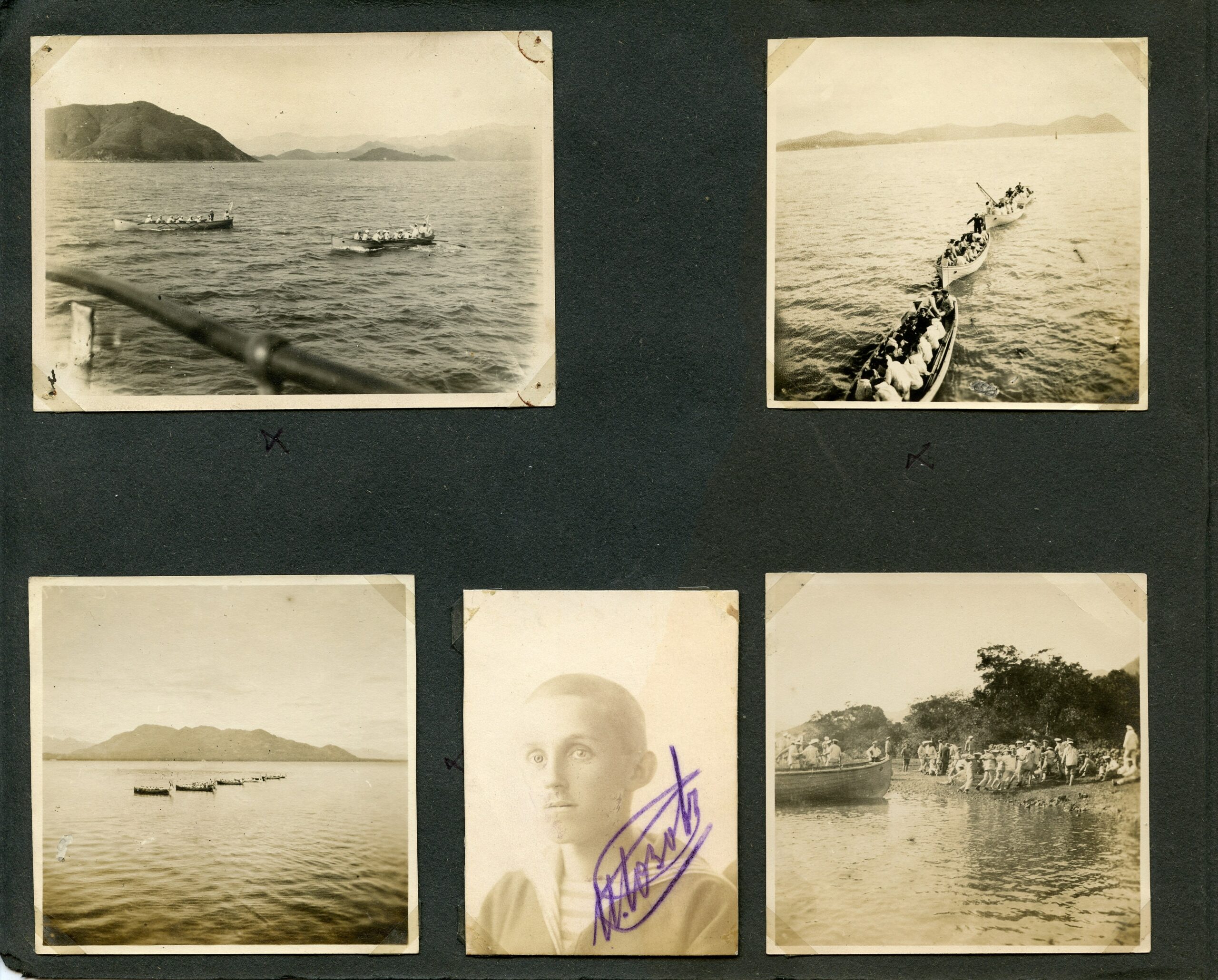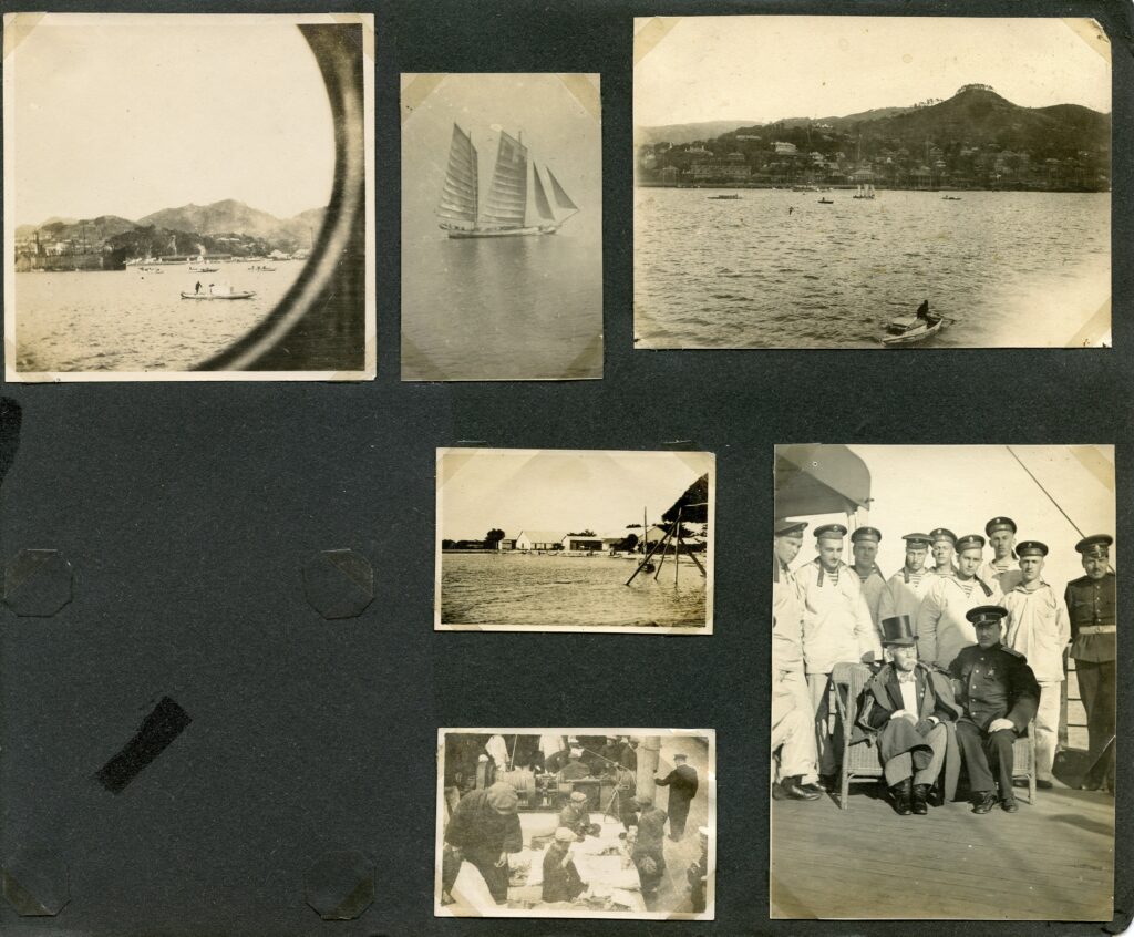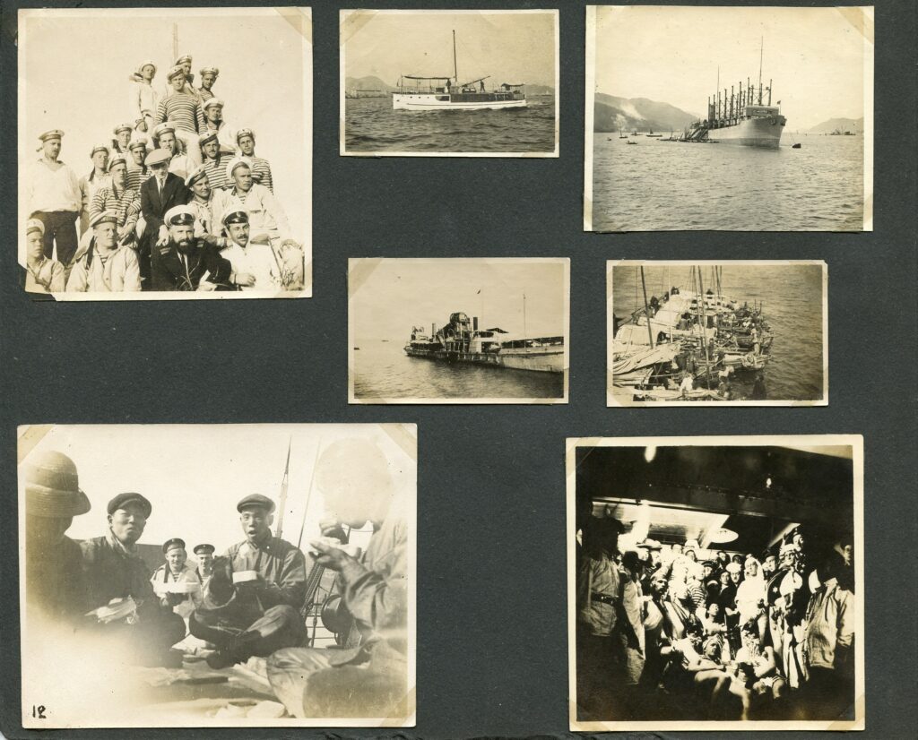 Стр. 24. Фотография 1 : Среди старых : лейтенант Ушаков (штурман), старший-лейтенант инж.-мех. Точиский, и французский преподаватель («педераст»). Фотография 2 : Гонконг. Катер. Фотография 3 (под 2-ой) : Около Гайфона. Фотография 4 : Американский … (?). Фотографи 5 (под 4-ой): Гонконг. Малайцы. Торговцы. Фотография 6 : Нагасаки. Чистильщики котлов за утреннем завтраком. Фотография 7 : Погребение шпака (традиция морская).