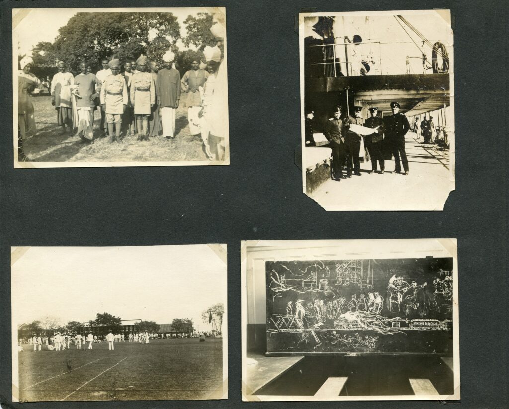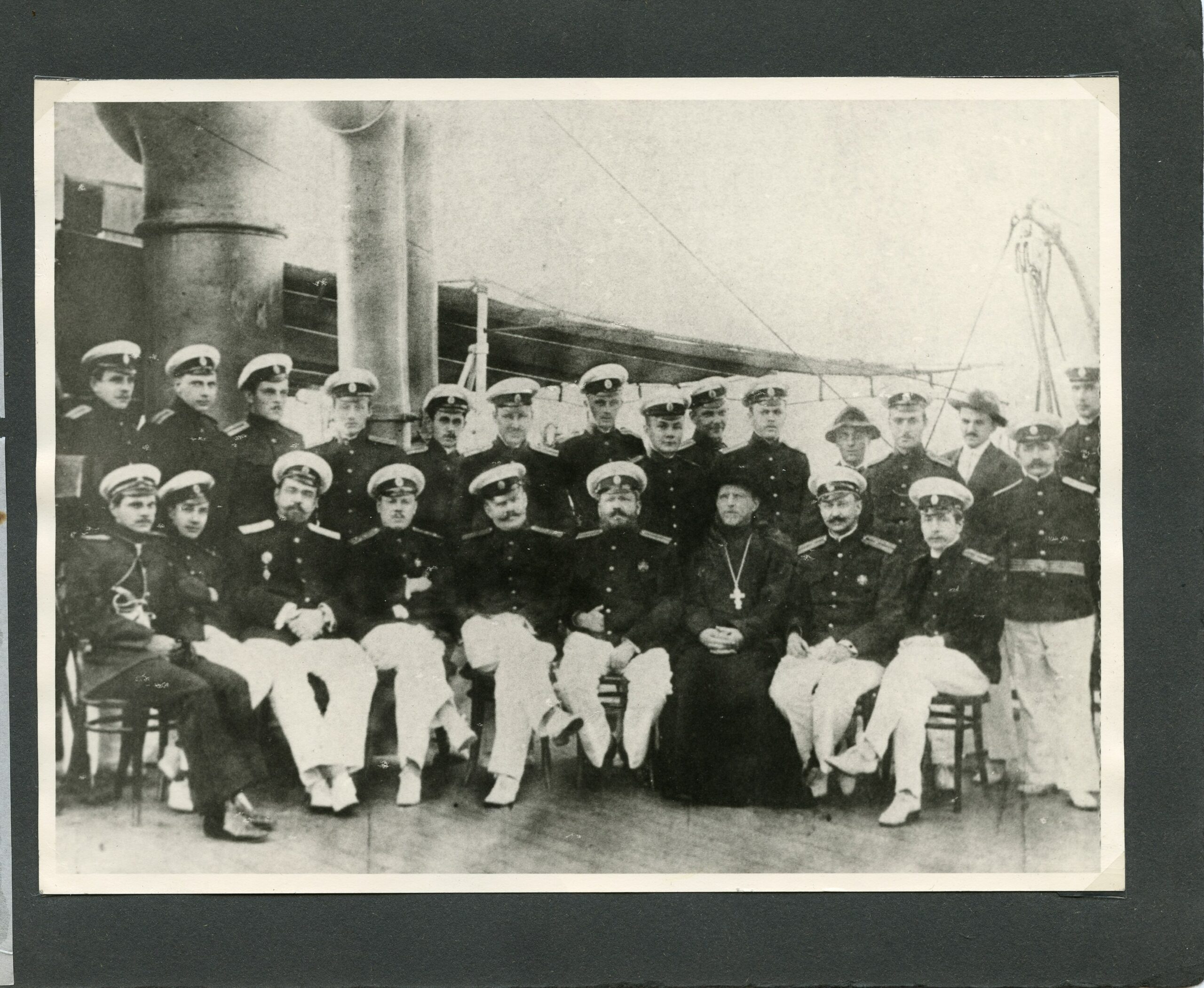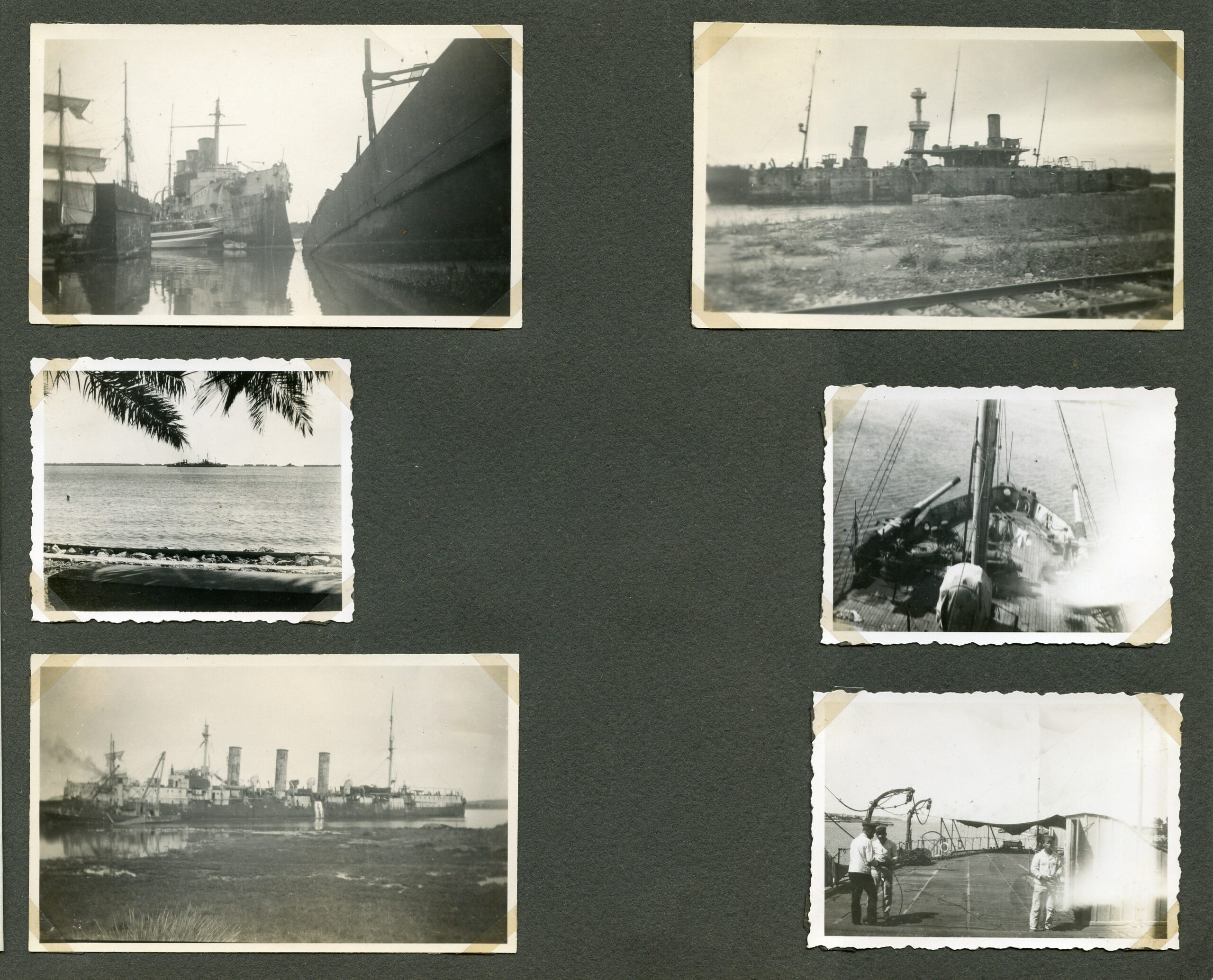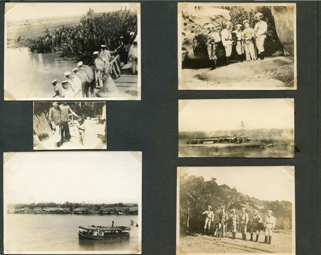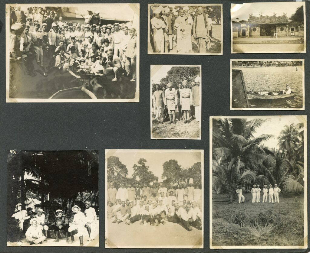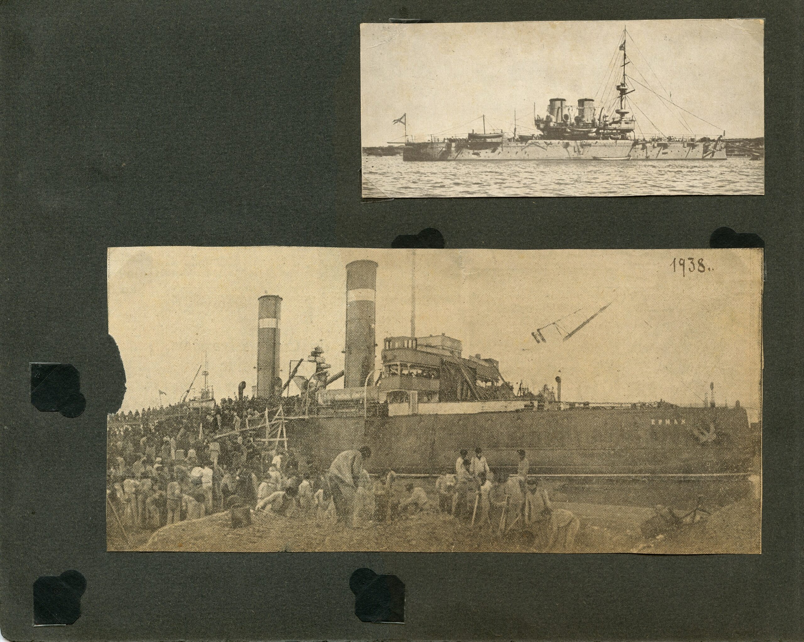 Стр. 24. Фотография 1 : Среди старых : лейтенант Ушаков (штурман), старший-лейтенант инж.-мех. Точиский, и французский преподаватель («педераст»). Фотография 2 : Гонконг. Катер. Фотография 3 (под 2-ой) : Около Гайфона. Фотография 4 : Американский … (?). Фотографи 5 (под 4-ой): Гонконг. Малайцы. Торговцы. Фотография 6 : Нагасаки. Чистильщики котлов за утреннем завтраком. Фотография 7 : Погребение шпака (традиция морская).