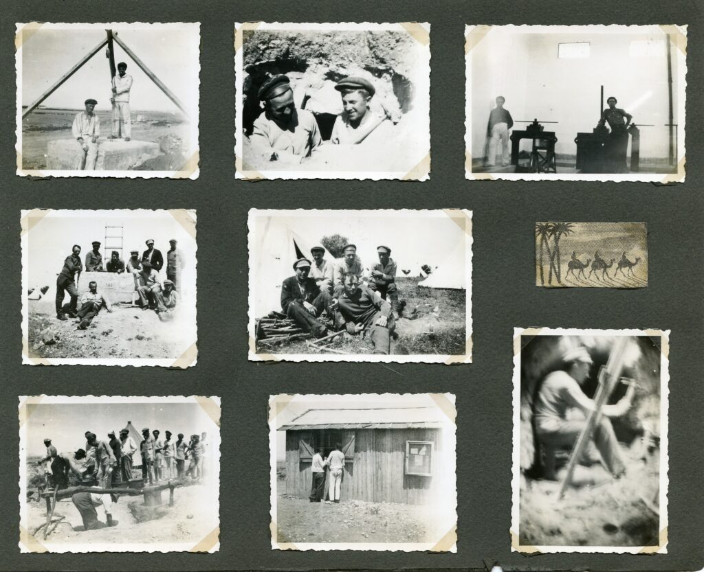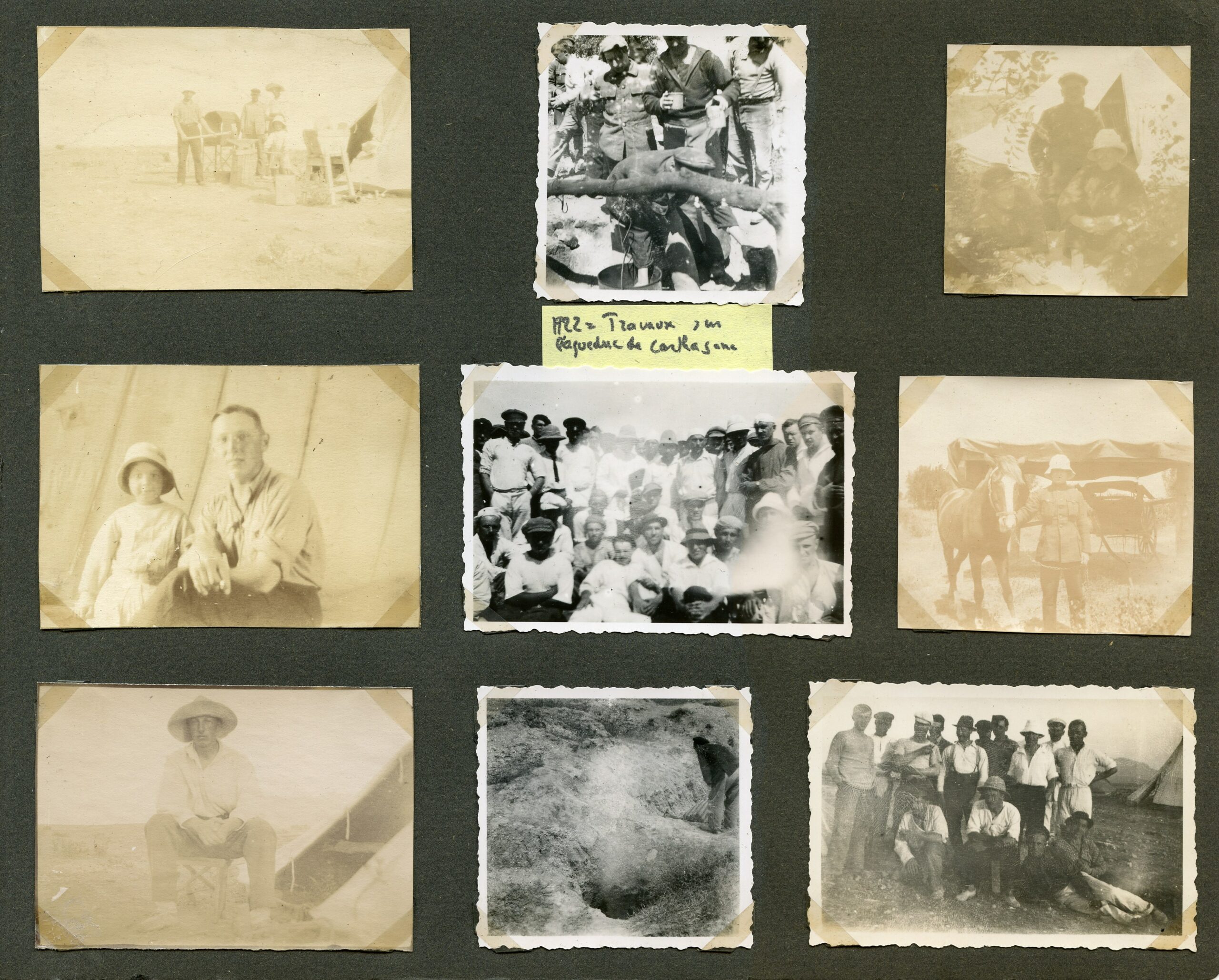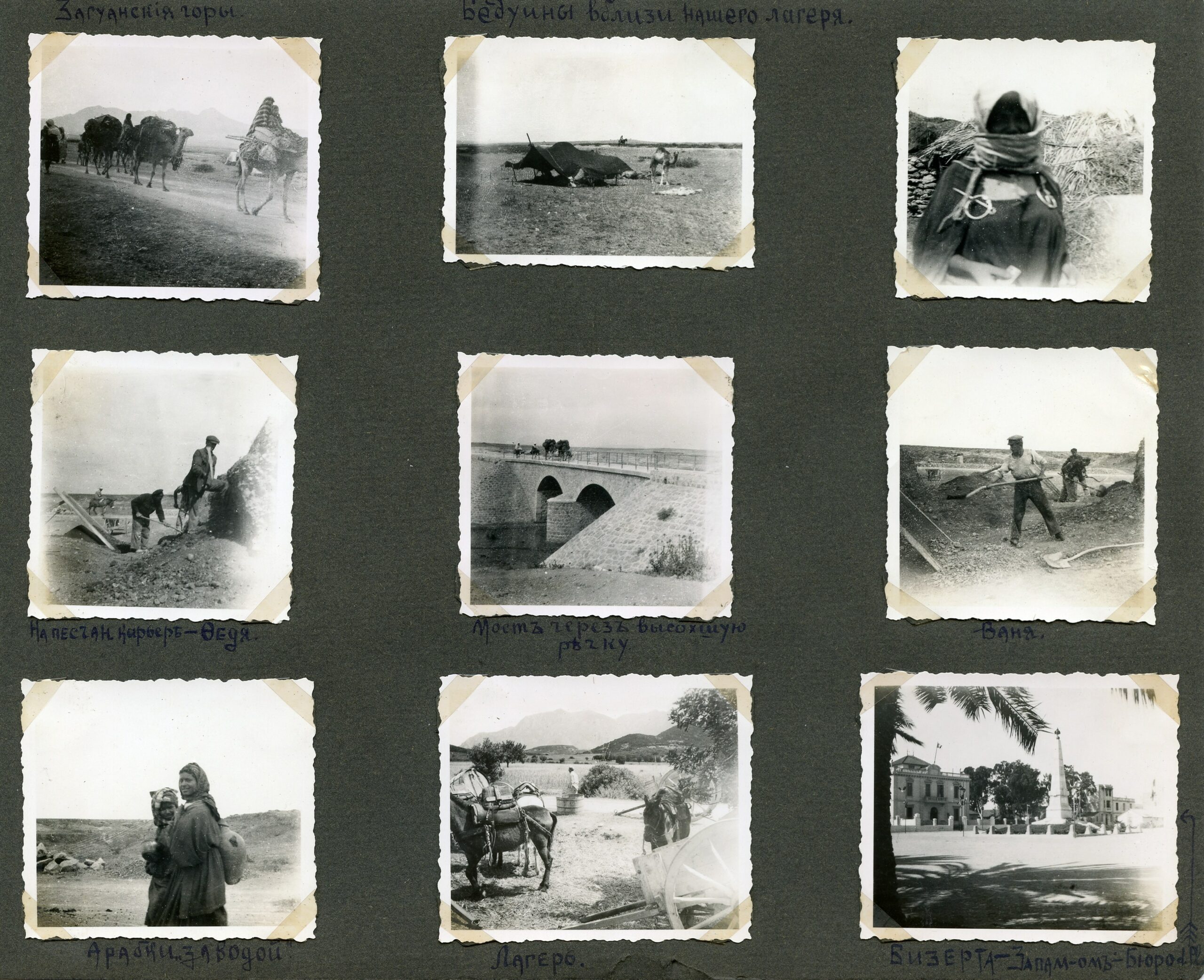 Стр. 37. (записи на кальке) Фотография 1, 2, 3 : 1921 – 1922 гг : Африка – Тунис : На карфагенских работах («Аквадюке»). Фотография 4 : Миша Юдин, Федя, Коля Тахтаров. Фотография 7 : Очередь у камбуза в полдень. Фотография 8 : Кантина нашего лагеря.  Фотография 9 : я внутри карфагенского акведюка (водопровода) с мартолетом (молотоком) в руках.