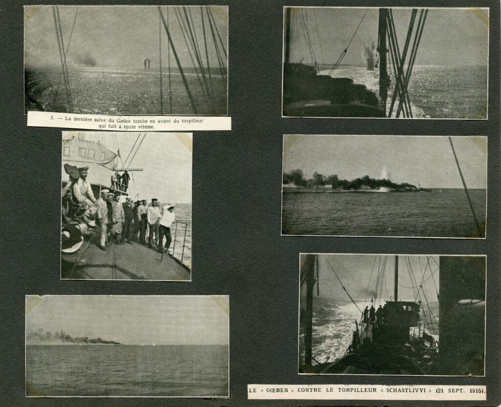 Стр. 46. Фотография 1 : (Перевод с французского) Последний залп Гебена падает спереди миноносца который уходит на полной скорости.