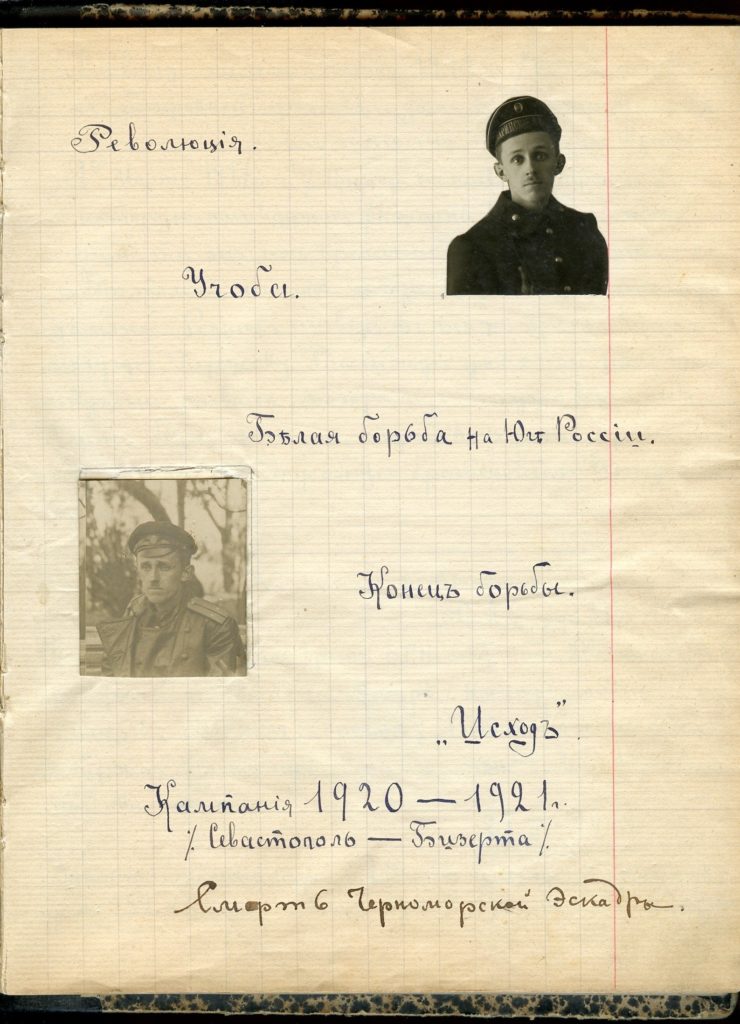 Меня особо заинтересовало душевное состояния молодого человека, впервые покинувшего семейный дом, чтобы вступить во взрослую жизнь через военного обучения. Эта подготовка научила его, помимо всего прочего, дисциплине, солидарности, долгу перед Родиной и суровой жизни моряков. Он открывал миры, о существовании которых не подозревал, и стал свидетелем в Петрограде потрясений так называемой «бескровной» 1917 года. Находясь в Екатеринославе, он принимал участие в борьбе с ультраправыми самостийниками, захватившими власть на Украине, чтобы вывести ее на путь независимости. В походе с тысячей военных он прошел 400 км, воюя против самостийников и большевиков, чтобы присоединиться к Белой армии в Крыму. В конце концов вместе с остатками Белой армии и Императорского Флота он был эвакуирован в Бизерту, Тунис, где был разоружен Русский Императорский флот.