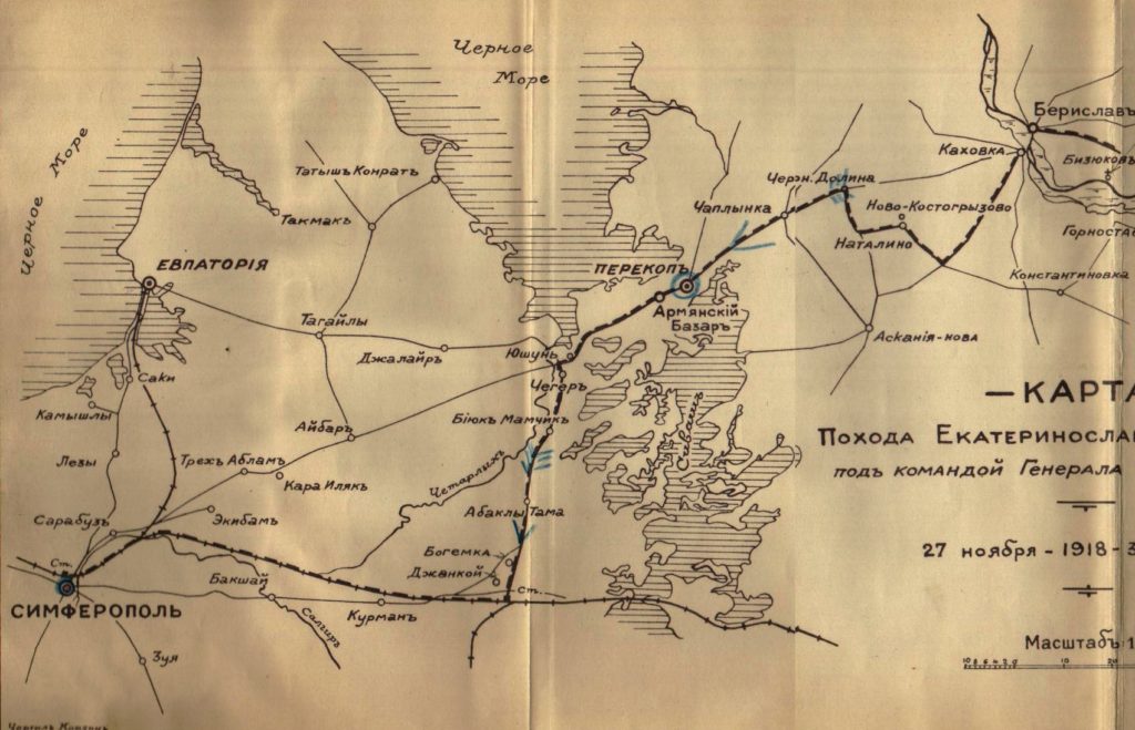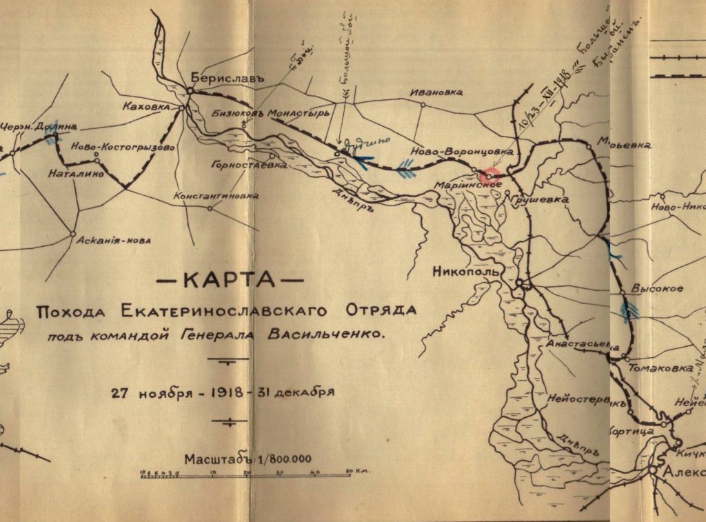 ЕКАТЕРИНОСЛАВСКИЙ ПОХОД1Запись ПЛ: Скоропадский лишился власти однако 8-й корпус гетмана сохранил боеспособность и отказался подчиниться повстанцам Петлюры. 23 ноября 1918 года между корпусом и войсками Петлюры произошли вооруженные столкновения, в результате которых Екатеринослав остался в руках корпуса. Однако ситуация вокруг города продолжала оставаться неопределенной для оборонявших его войск, и командиры корпуса и большинство бойцов сформировали отряд под командованием генерала Васильченко и решили присоединиться к Добровольческой армии (около 50 000 человек под командованием генерала Деникина), сражавшейся с большевистским узурпатором. Отряд вышел из Екатеринослава с более чем 1000 человек, включая 850 пехотинцев и 150 кавалеристов, большинство из которых были офицерами, и был оснащен пушками и броневиками. Маршрут преодолел более 500 км в сложных погодных условиях. Многочисленные бои с войсками Петлюры, анархистами Махно и войсками полковника Григорьева (сторонника Петлюры) проходили с успехом, особенно в битве под Бериславлем с последними. Отряд присоединился к Добровольческой армии в конце декабря. Этот вклад оснащенных и опытных людей был ценен для белых войск. 26 декабря 1918 года между командующим казачьими войсками генералом Красновым и генералом Деникиным было заключено соглашение о создании Вооруженных сил Юга России, которые в июле 1919 года насчитывали около 250 000 человек.