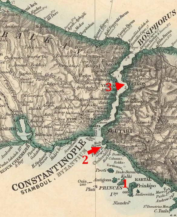 Когда мы утром стали, по выходе из Босфора, входить в Константинополь, то увидели, что часть судов Черноморского Флота ухе стояла на рейде ввиду «Принцевых» островов. Мы стали далеко в проливе, ближе к Азиатскому берегу.