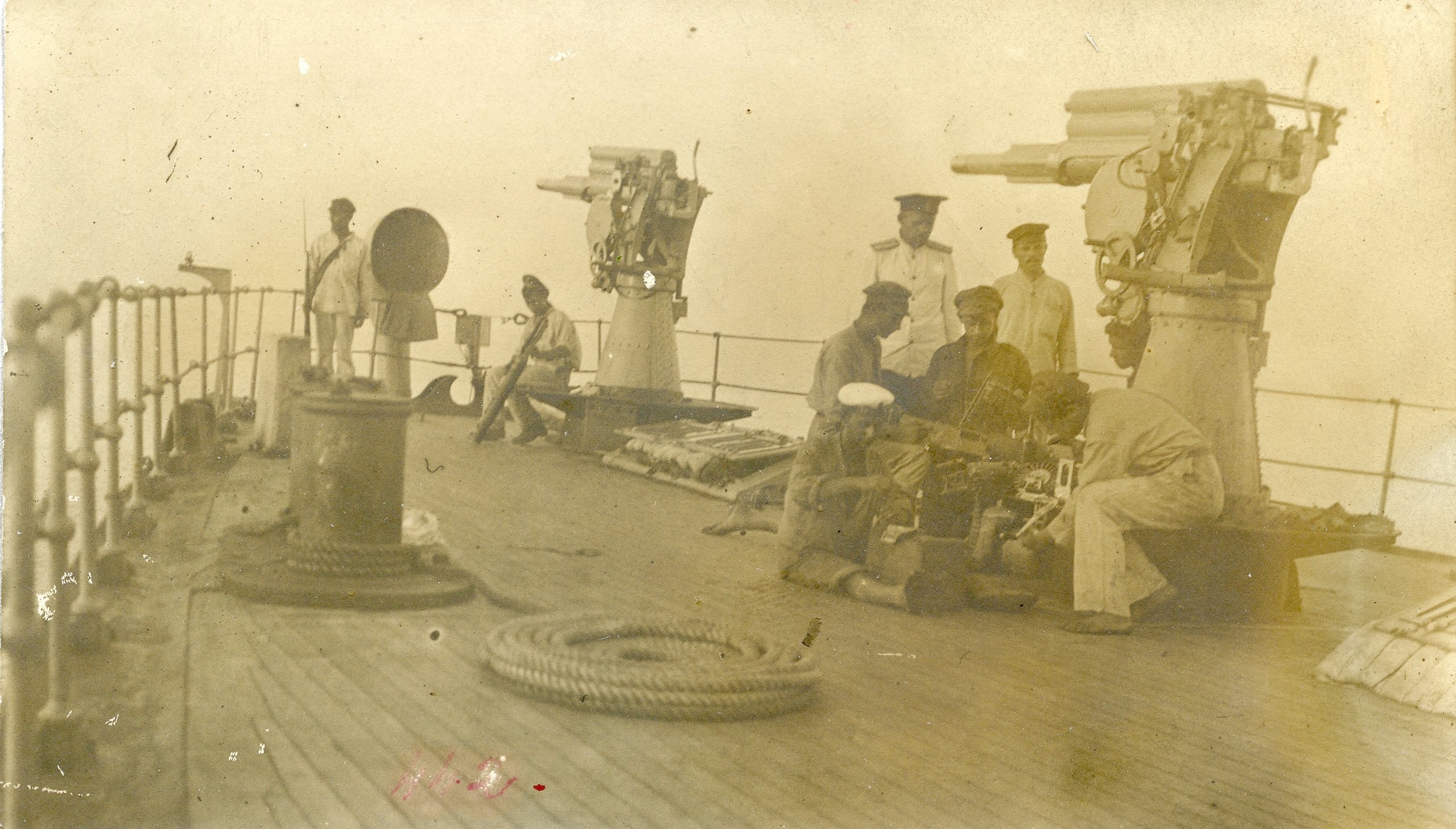 «… La vie est bien meilleure sur le croiseur. Plus d’ordre a été conservé et notre vie se déroule de manière plus adéquate et plus saine. Durant la matinée, de 8 h 15 à 11 h 30, travaux sur le bateau – réparations, nettoyage, peinture, travaux de pont, et dans l’après-midi débute ma vie privée. J’ai un kayak et un yawl à 6 rames, sur lesquels je navigue à la voile, faisant la course avec deux canots du Gueneral Alexeïev… Ensuite, je lave mes vêtements, ce que j’aime faire, mais avec chaque lavage je remarque que la toile devient plus fine et moins dense… Pourtant, le plus important pour moi, c’est mon bureau, j’y lis, écris mes lettres et réfléchis à propos des problèmes qui m’intéressent… A d’autres moments de mon existence c’est la musique et le chant au carré des officiers. Nous avons un mécanicien, le lieutenant M., qui chante étonnamment bien et mon compagnon de cabine est un excellent pianiste.